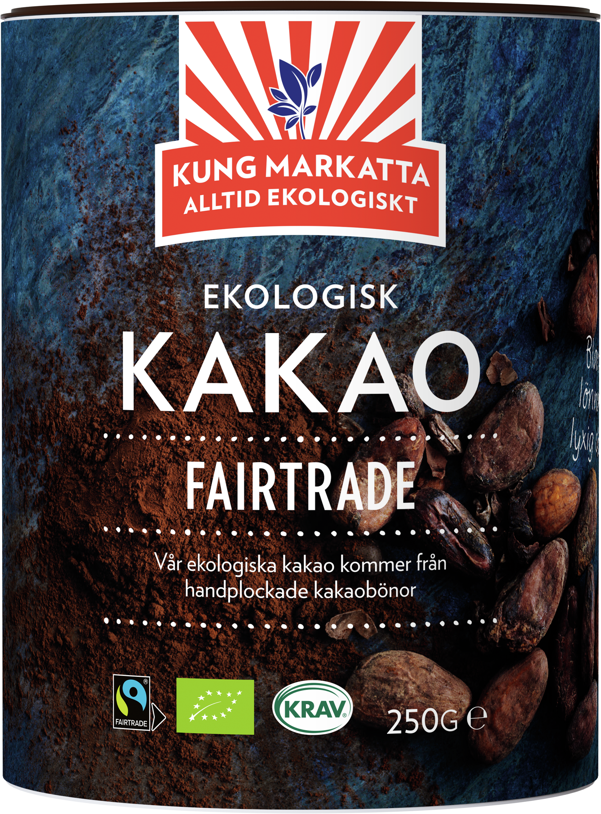 Kung Markattas Kakao är en ljuvligt god kakao på handplockade kakaobönor! Den görs på ekologiska kakaobönor som både har KRAV- och Fairtrade-certifiering för att värna om kakaoodlarna och vår miljö. Vi använder en noga avvägd kombination av kakaobönorna som gör kakaon extra lyxig. Gör din godaste kakaodryck, använd i bakverk och som smakförhöjare i mat.