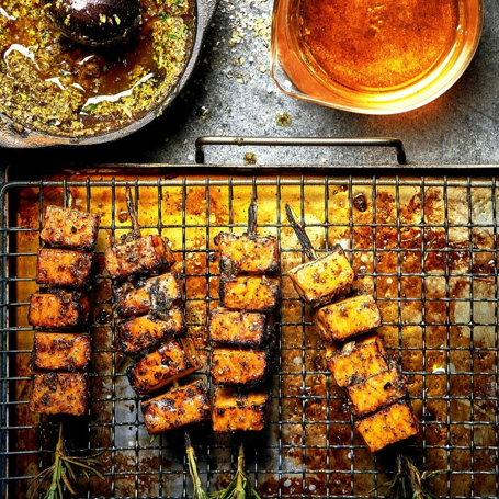 Grilla tofun, först över hög värme, lägg dem sedan på indirekt värme och låt dem rostas en stund. Eller lägg dem i en ugnsform och efterstek dem i ugnen i 5–10 minuter på 180 grader.